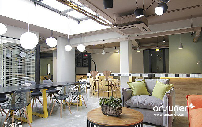 整体呈现出工业的样貌,搭配绿植景观设计,在拘谨与放松之间达成一个舒适的平衡点。