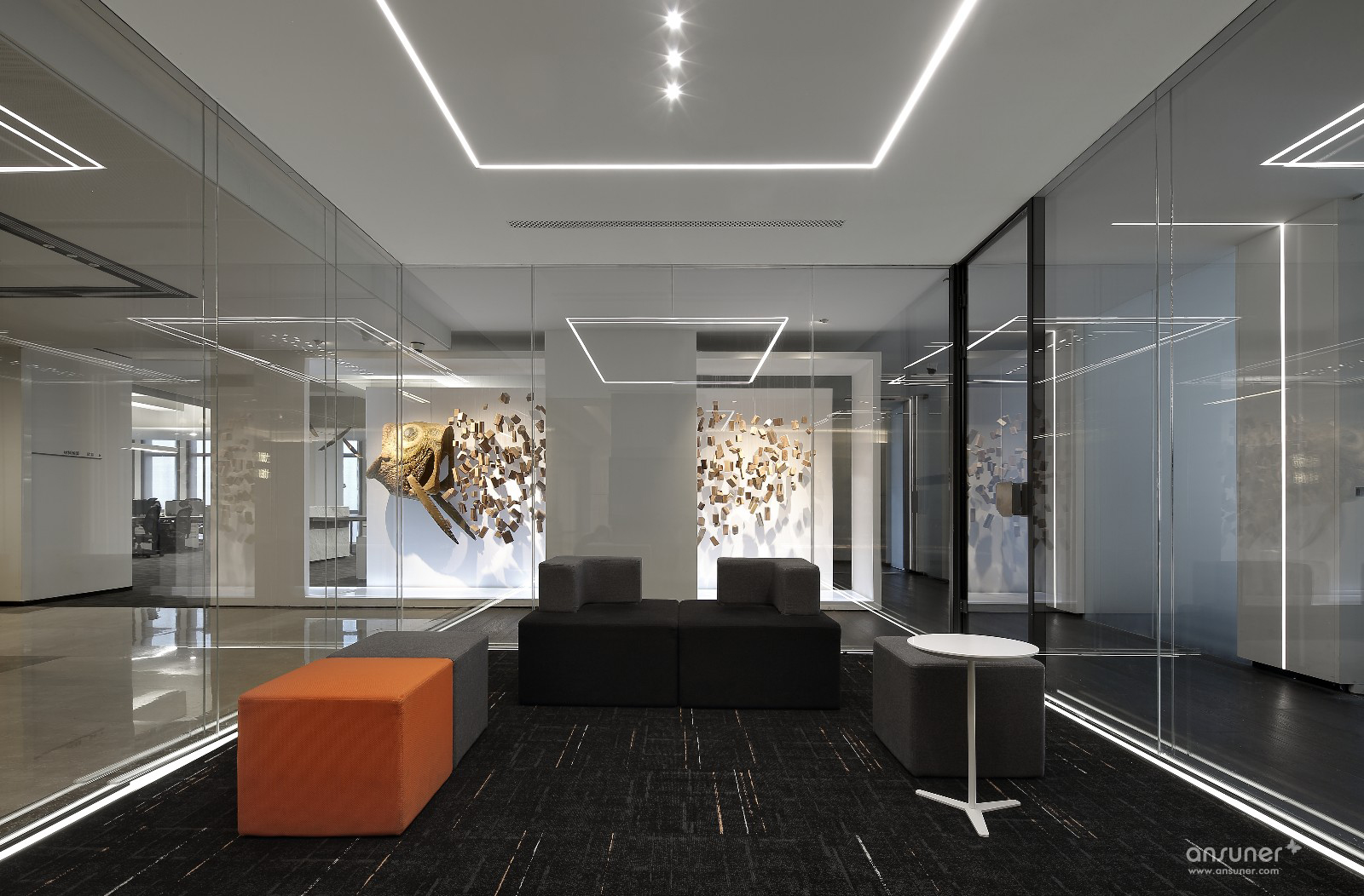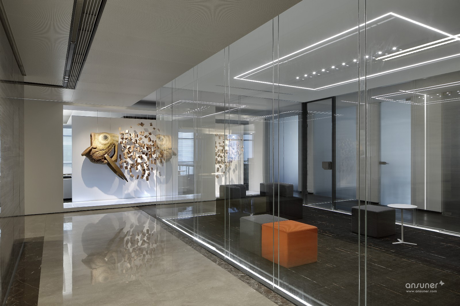 门厅接待区的视觉呈现,表述空间设计的构想初心。设计并未沿用对称、均衡的常用手法,而是以错位、悬拉的三面白墙,细分空间三重场域。
