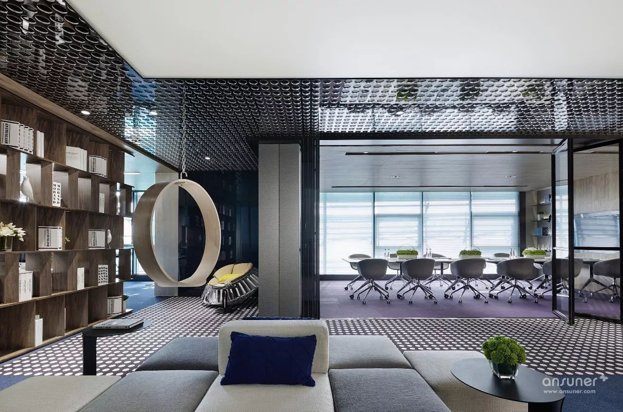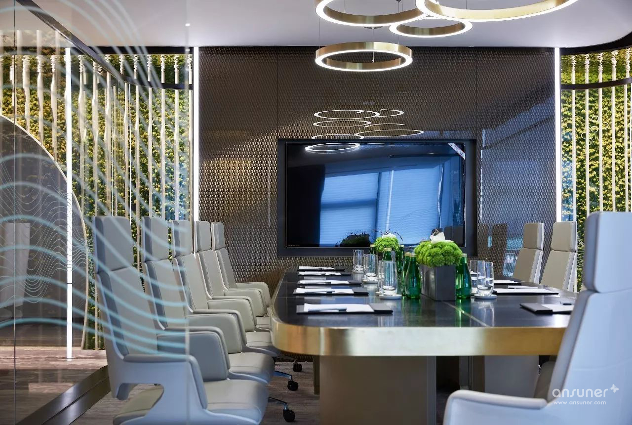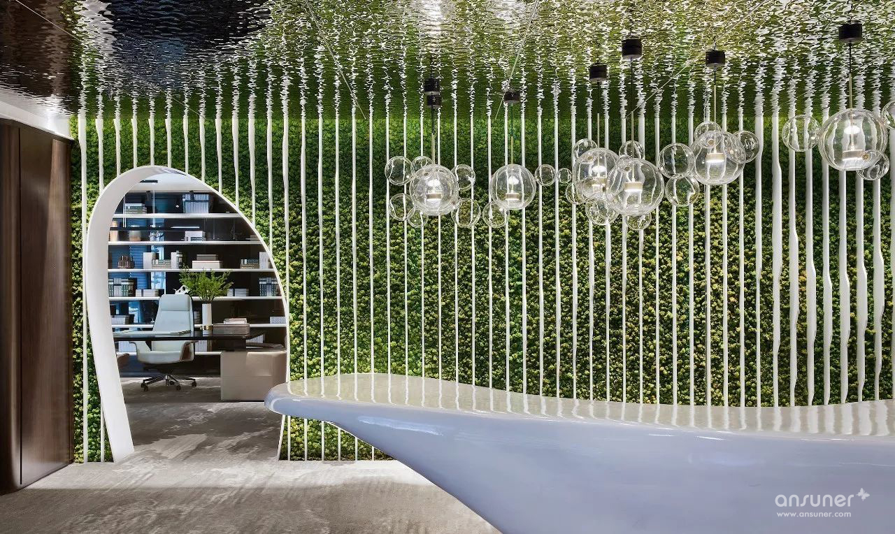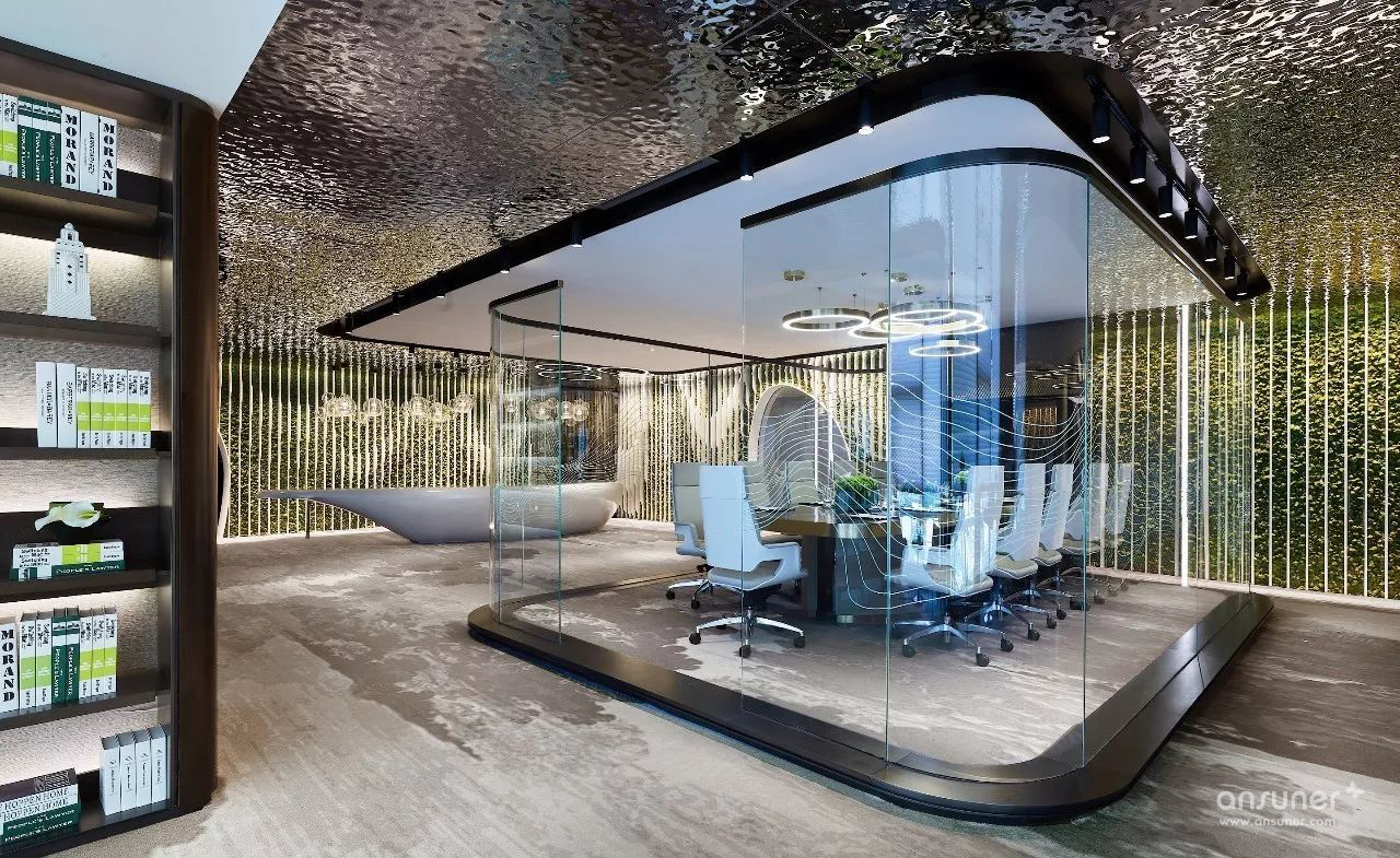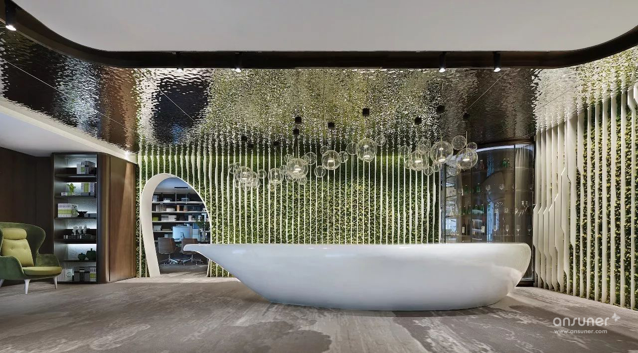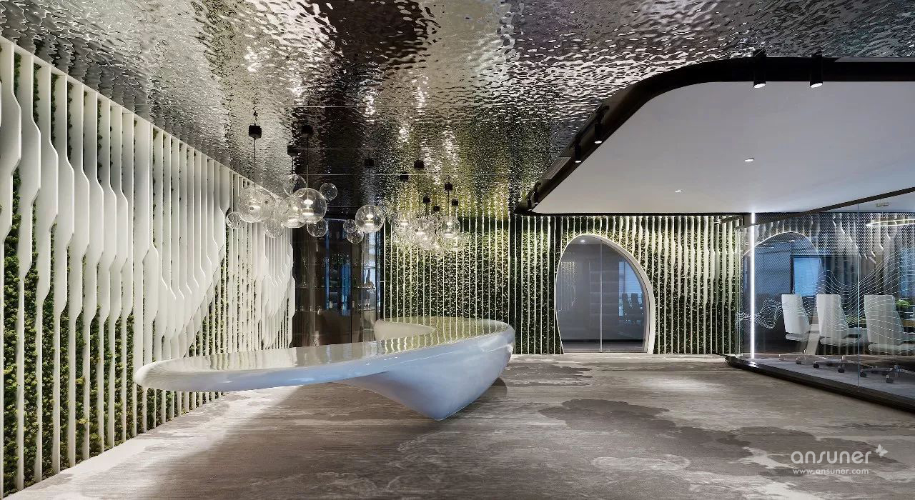 室内设计沿用原建筑设计的“山水城市”概念,配合技术创新,构筑一个都市中的逆世界,天花顶部似水,墙面线型为山,地面像漂浮着的云朵的地毯,融入自然生态美学,打破传统室内空间的固有形态,营造逆空间的独特视觉效果。