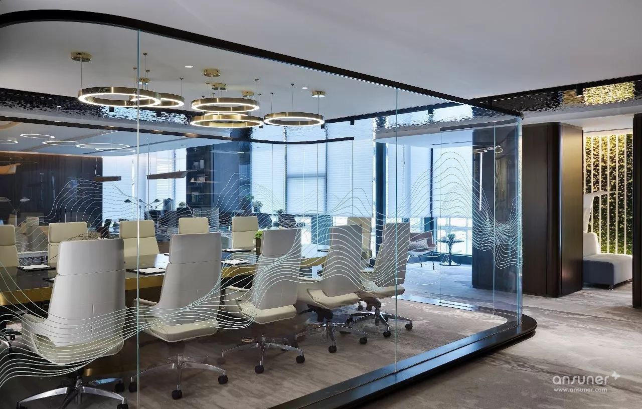经理室融入会议功能,提高会议效率的同时大大的节约了功能空间。书吧区域可利用休息时间进行充电,让办公更具人性化,气泡式智能会议功能让办公环境更具科技感,设置互动讨论区可随时进行头脑风暴,座位对应墙面配置视频电视可随时转换为会议模式。