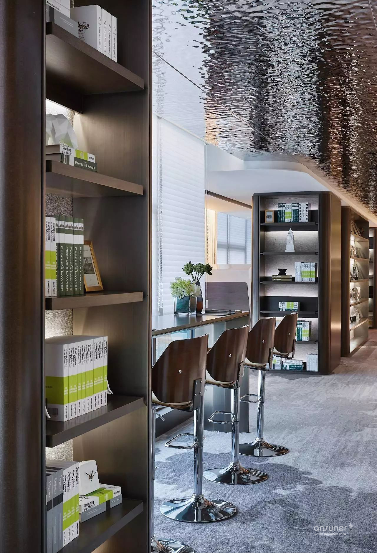 经理室区域独立,让商务洽谈更具私密性。空间运用点线面构成概念,办公区利用书柜分隔,既做到了空间上的划分,又可通过展示柜内陈设呈现个人雅兴,体现个人品位。