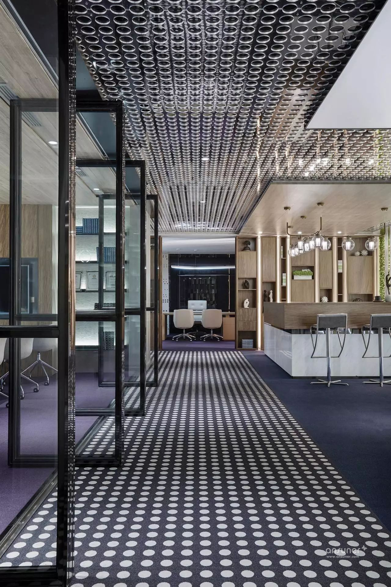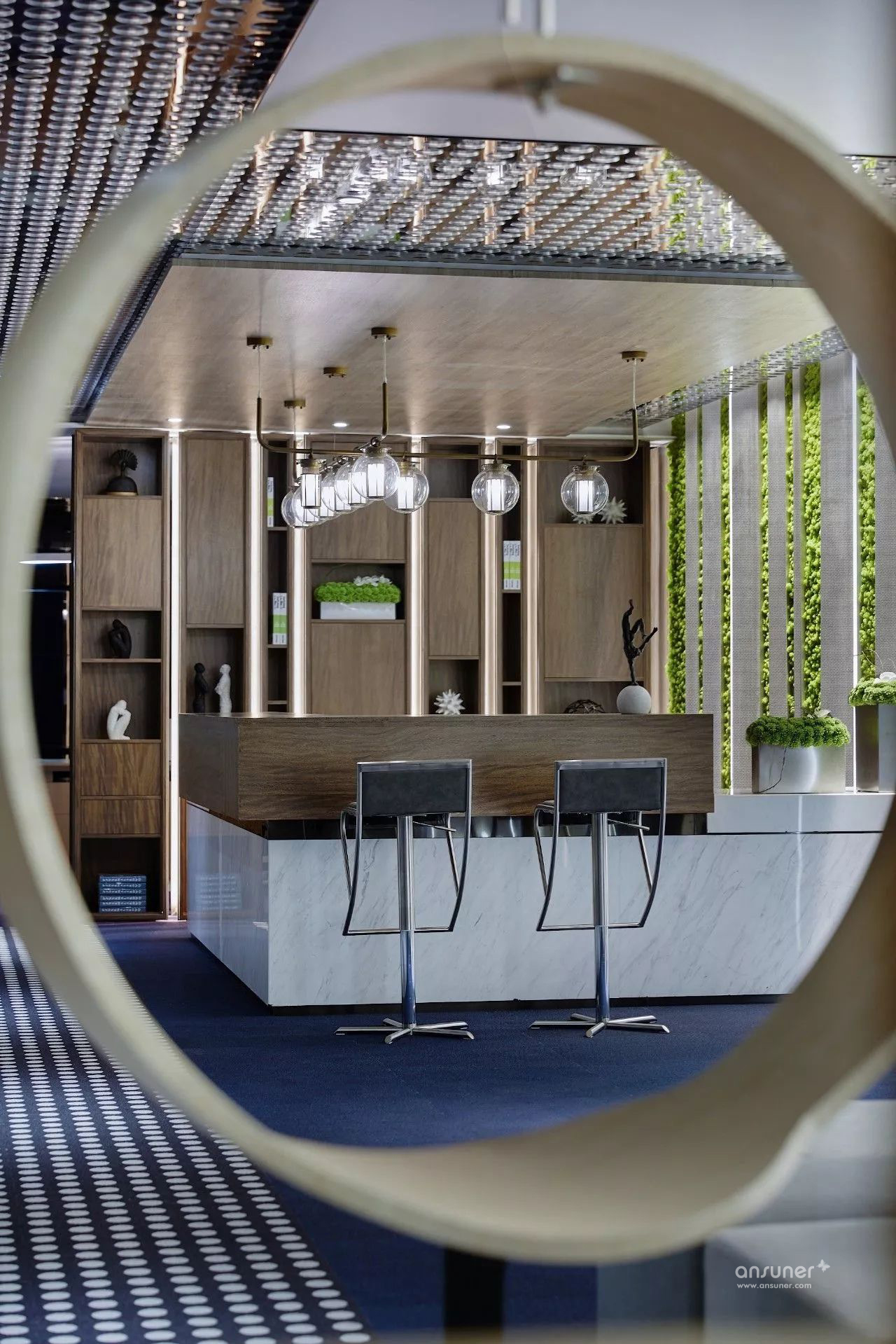 华体会体育官方在线官网运用石材、金属、木饰面结构穿插的巧妙手法呈现出多功能接待厅、接待台、水吧区的现代感与创新性 。