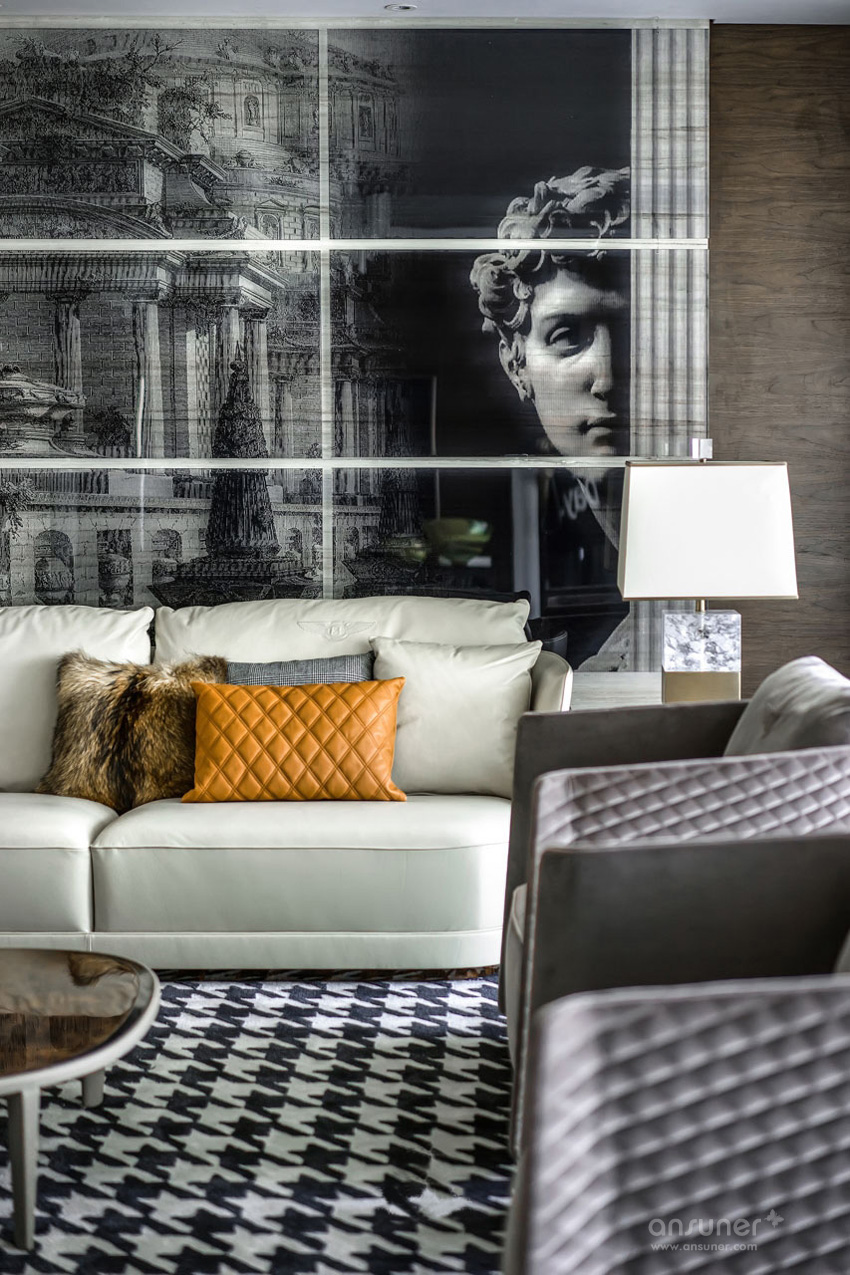璀璨的水晶吊灯,做工精致的皮沙发,独具特色的茶几,Bentley经典的菱形格纹,点缀其间的大卫挂画,在同一空间,形成独到的艺术氛围与审美气度。而空间中的饰品,则在每一个细节上将低调奢华演绎得淋漓尽致。