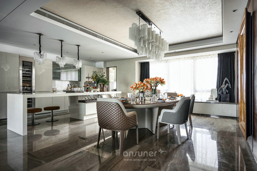 346平米的半岛城邦3号楼B户型样板间,由深圳布鲁盟设计操刀其软装设计,通过古罗马时期的传统艺术与Bentley Home细腻精致的细节交融,让整个空间极具品质感。以做旧的古罗马灰为主色调的空间里,独具风情的格纹地毯,工艺精细的家具,充满艺术性的饰品挂画在丰富的层次中表现得让人眼前一亮。