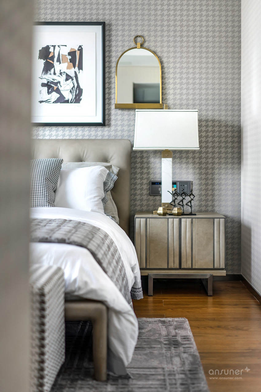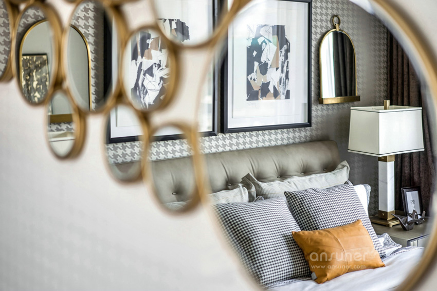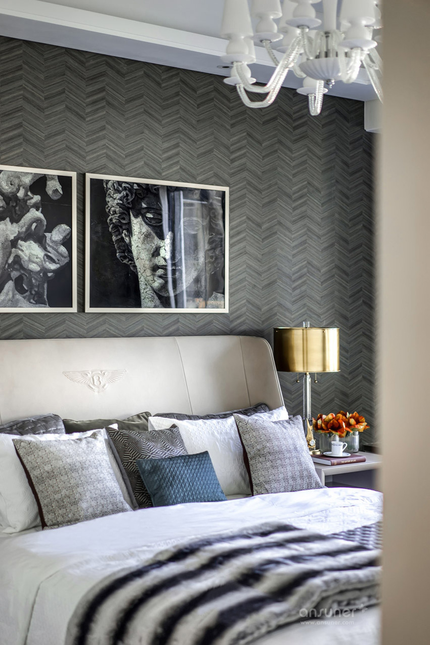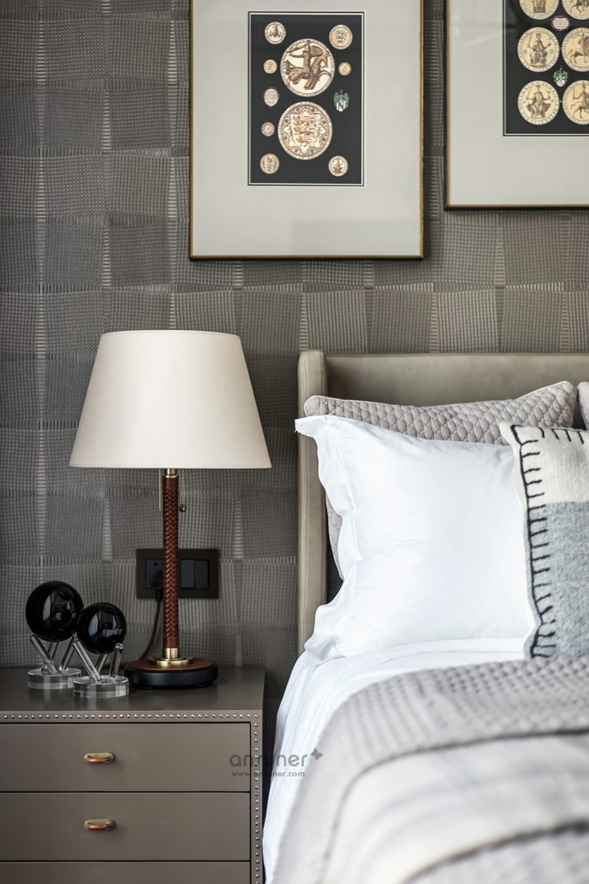 次卧的设计亦是恰到好处地表现着艺术融入生活的点滴,将内敛而深刻的英伦风情延展开来,将英伦艺术与古罗马经典的元素相互结合、文化碰撞成为空间设计的有机整体。
