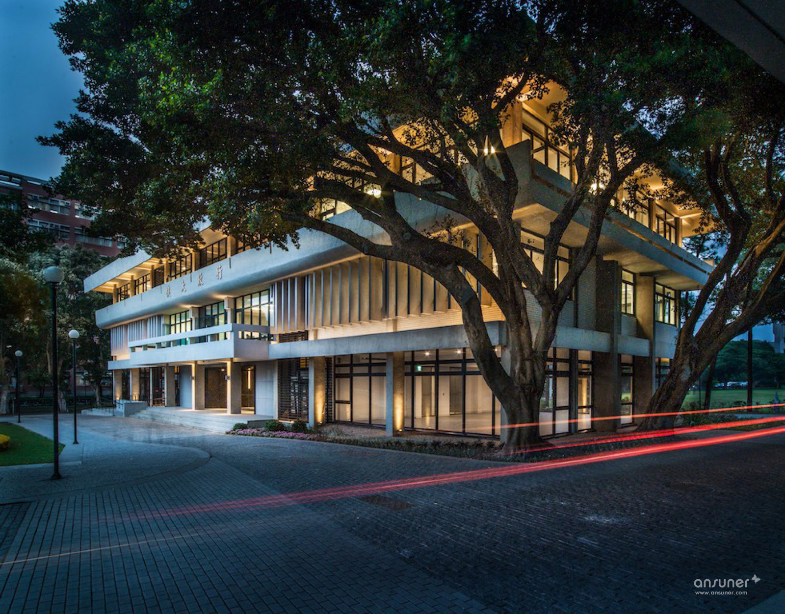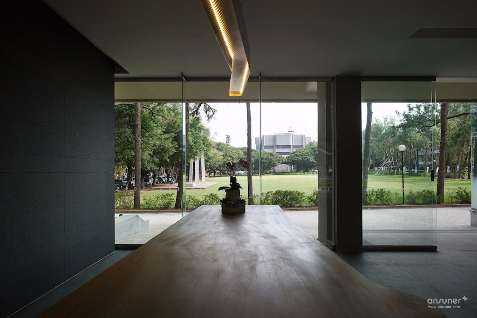 拾级而上,厚实的石块墙体同样以15度的斜轴贯穿二、三楼。短轴长轴的概念重现;短轴串起前后的透明电梯及楼梯,是各楼层的动线枢纽;长轴左侧的大会议室与沿着长轴排开的工作空间,紧密而不冲突。 三楼的校长室与副校长室分倨长向轴线的左右两侧,突显其重量。