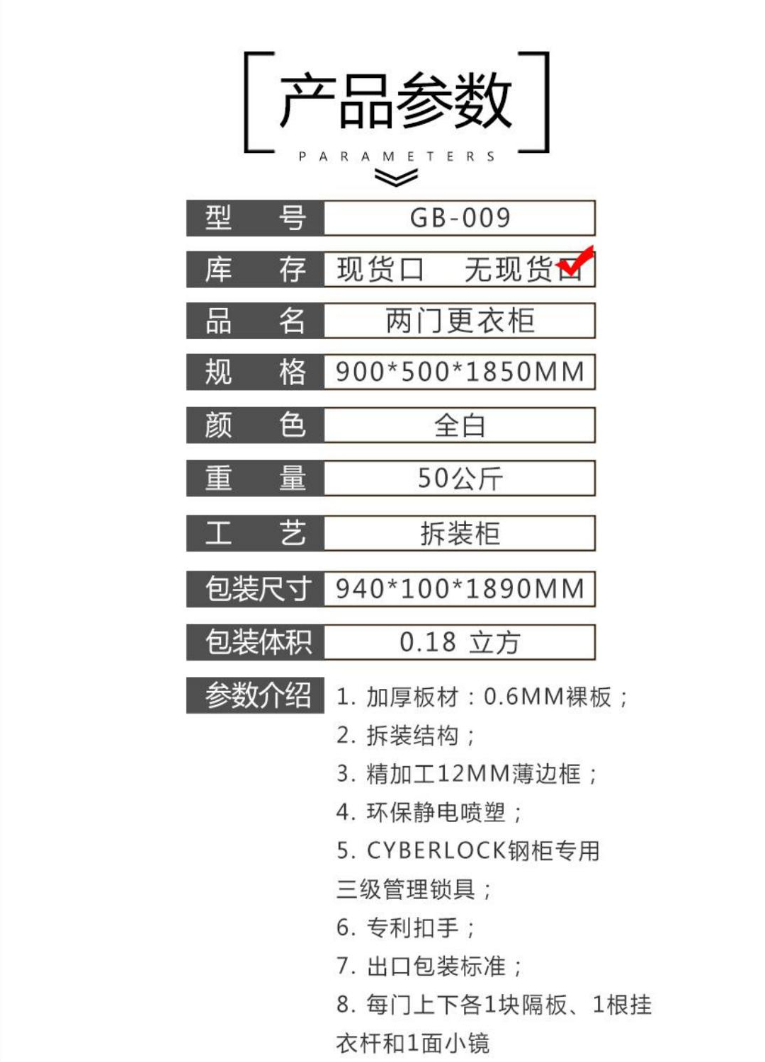 1.加厚板材:0.6MM裸板 2.拆装结构; 3.精加工12MM薄边框; 4.环保静电喷塑 5.CYBERLOCK钢柜专用三级管理锁具; 6.专利扣手 7.出口包装标准; 8.每门上下各1块隔板、1根挂衣杆和1面小镜。