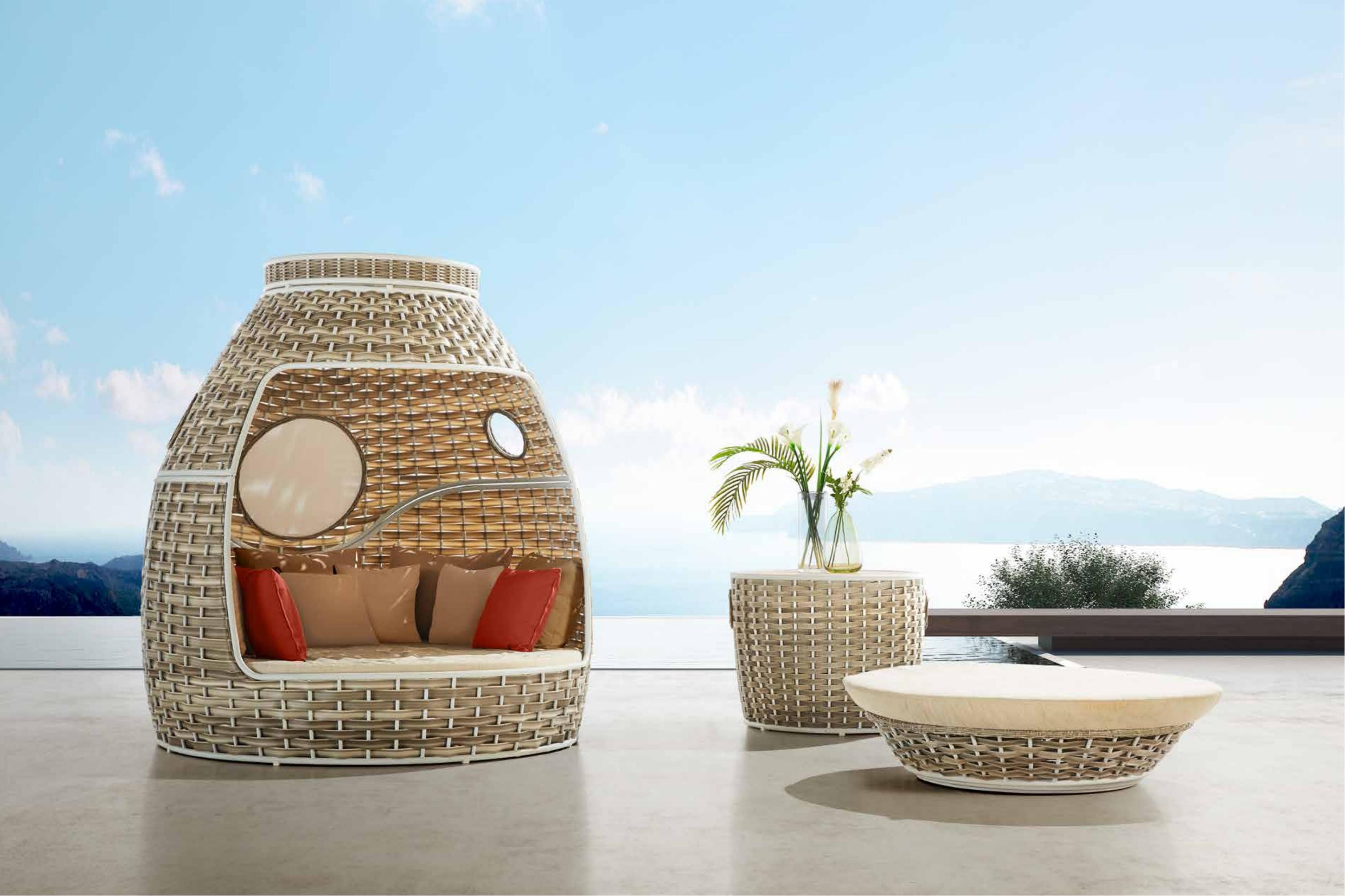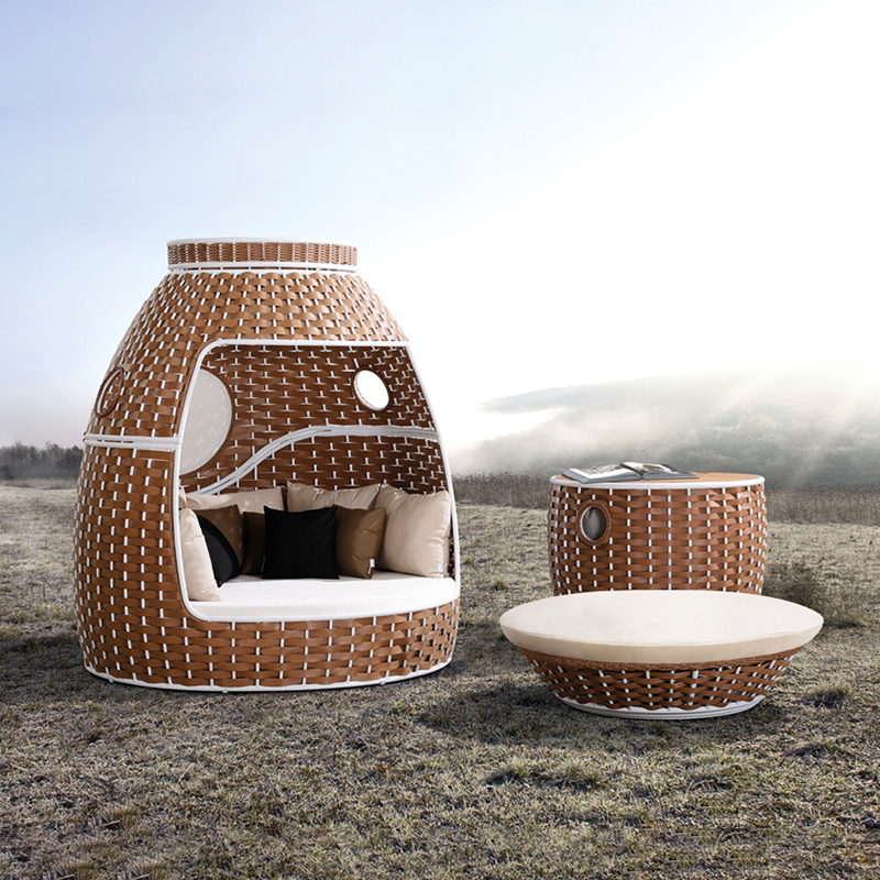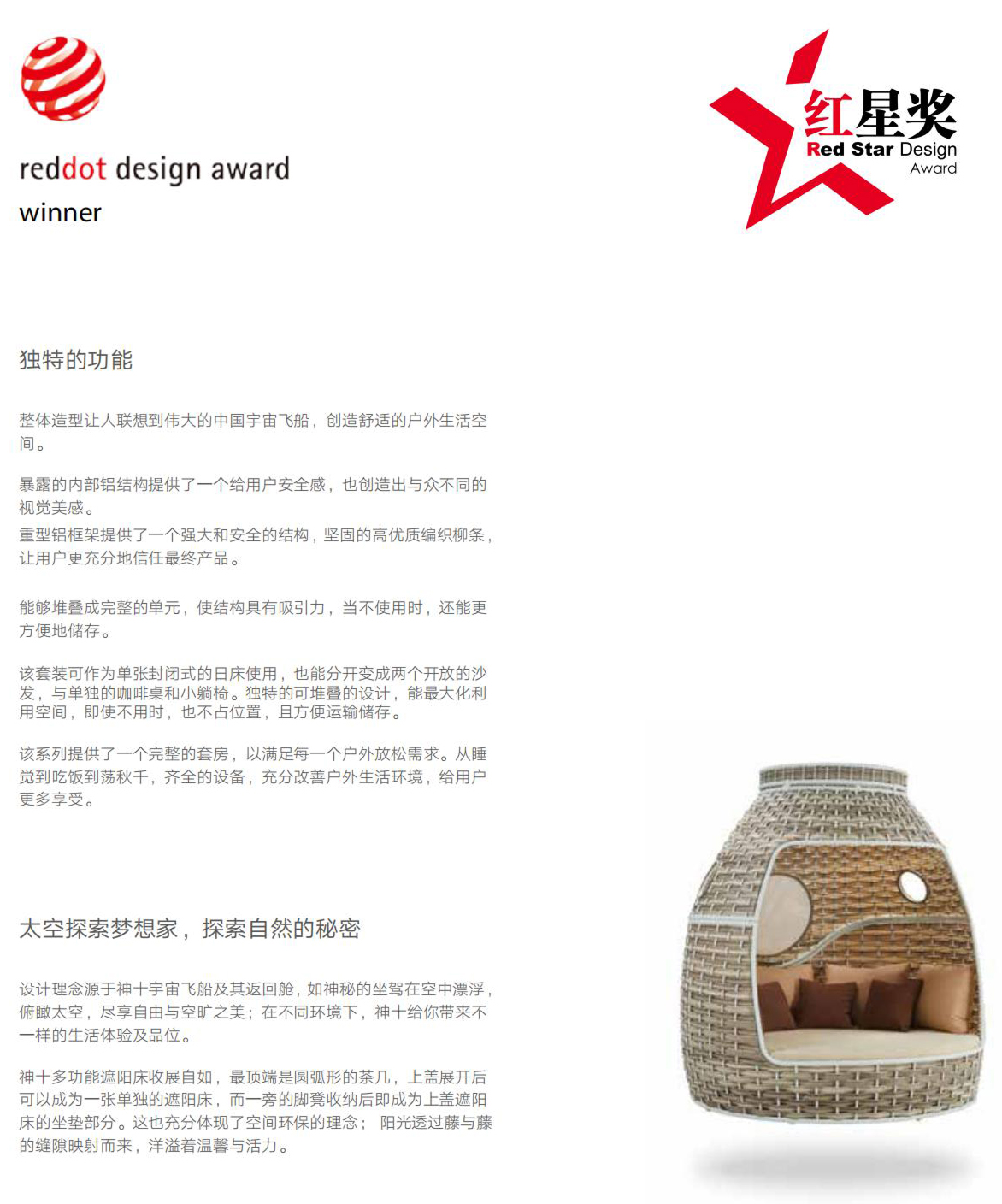 设计灵感:神舟十号宇宙飞船返回舱 “变”---顶盖拆分后可变为圆弧形的茶几,上盖展开后可以成为一张单独的沙发床,而一旁的脚凳收纳后即成为上盖坐垫,整个产品摇身一变为两个沙发床套件 “多”---配有21个舒适坐背垫(10个大,11个小),可以无忧舒适地躺仰在每个角落 “大”---座高36cm, 依照人体功能学设计,整体设计宽敞,可以容纳一家三口 “柔”---柔软的环保PE藤编制让原本硬朗的神十返回舱,多了一份柔情 整体造型让人联想到伟大的中国宇宙飞船,创造舒适的户外生活空间。暴露的内部铝结构提供了一个给用户安全感,也创造出与众不同的视觉美感。 重型铝框架提供了一个强大和安全的结构,坚固的高优质编织柳条,让用户更充分地信任最终产品。能够堆叠成完整的单元,使结构具有吸引力,当不使用时,还能更方便地储存。 该系列提供了一个完整的套房,以满足每一个户外放松需求。从睡觉到吃饭到荡秋千,齐全的设备,充分改善户外生活环境,给用户更多享受。 该套装可作为单张封闭式的日床使用,也能分开变成两个开放的沙发,与单独的咖啡桌和小躺椅。独特的可堆叠的设计,能最大化利用空间,即使不用时,也不占位置,且方便运输储存。
